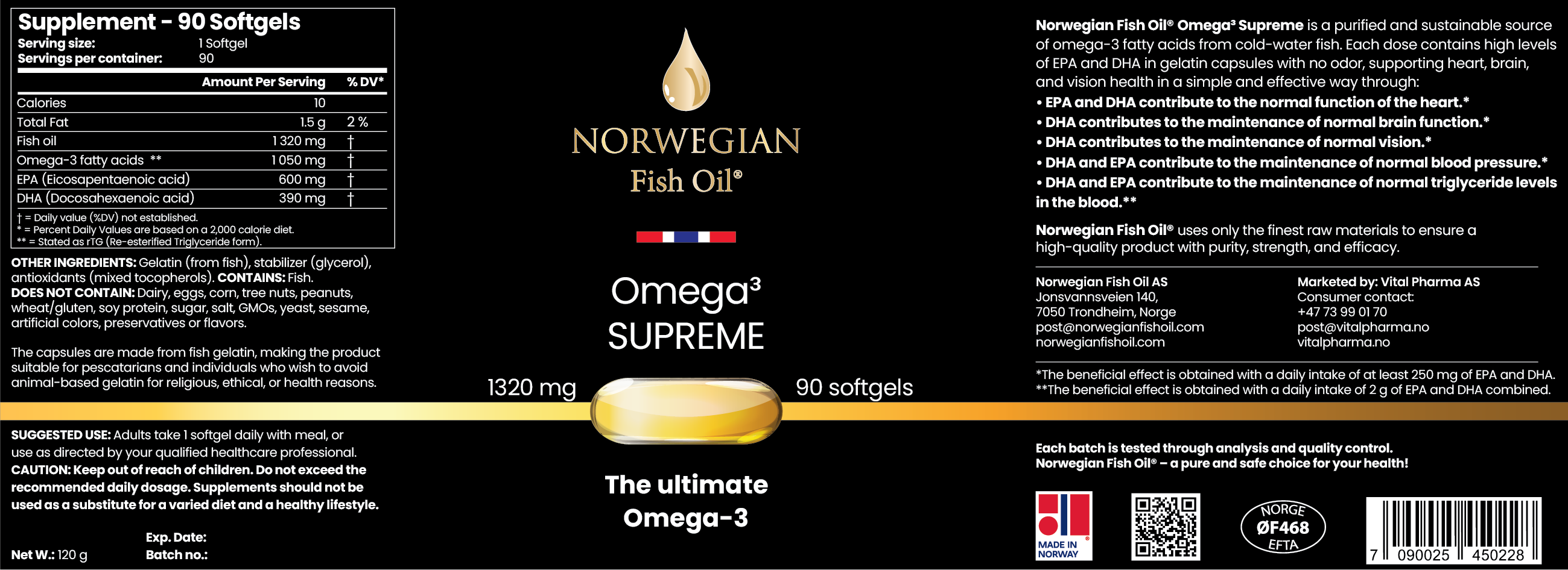 Omega-3 Supreme delivers an outstanding 1050 mg of Omega-3 per capsule, including 600 mg EPA and 390 mg DHA, in a highly bioavailable re-esterified triglyceride (rTG) form. With over 80% Omega-3 concentration in a single 1320 mg softgel, it ranks among the most potent Omega-3 supplements available globally.